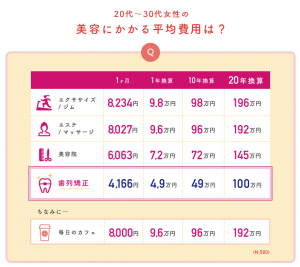 20年換算すると、「歯列矯正」よりも日々の美容にかかる費用のほうが高くなることが分かり、「歯列矯正」の生涯価値の高さが伺えます。
