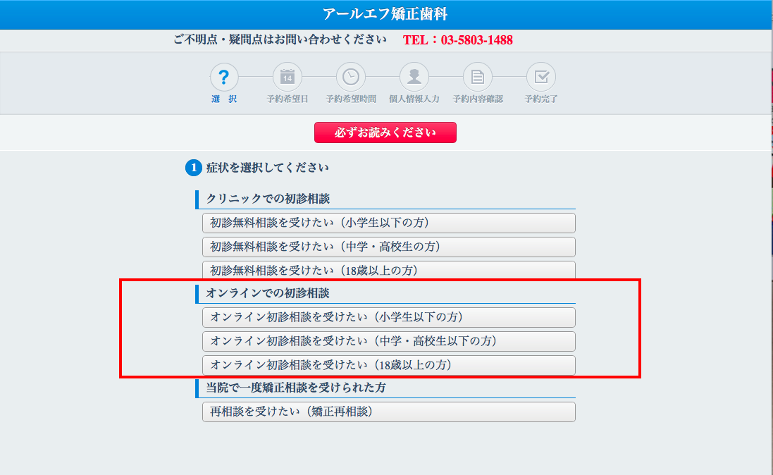 WEB予約サイトよりオンライン初診相談の日時をご予約下さい。ご希望の日時がない場合は、お電話(03-5803-1488)にてご連絡いただければ柔軟に対応する事も可能です。