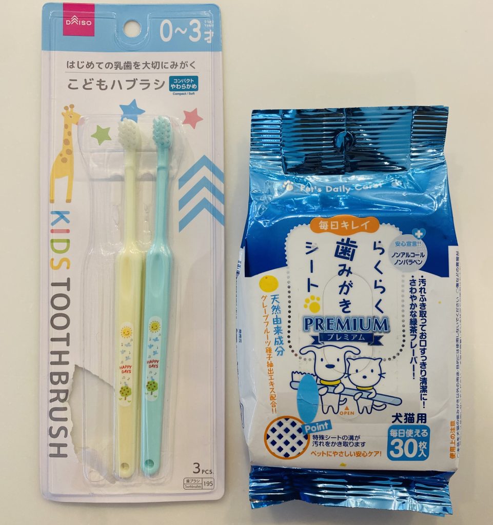 歯ブラシはこのようなこども用のものを使ったり、歯磨きシートで拭いたりします。