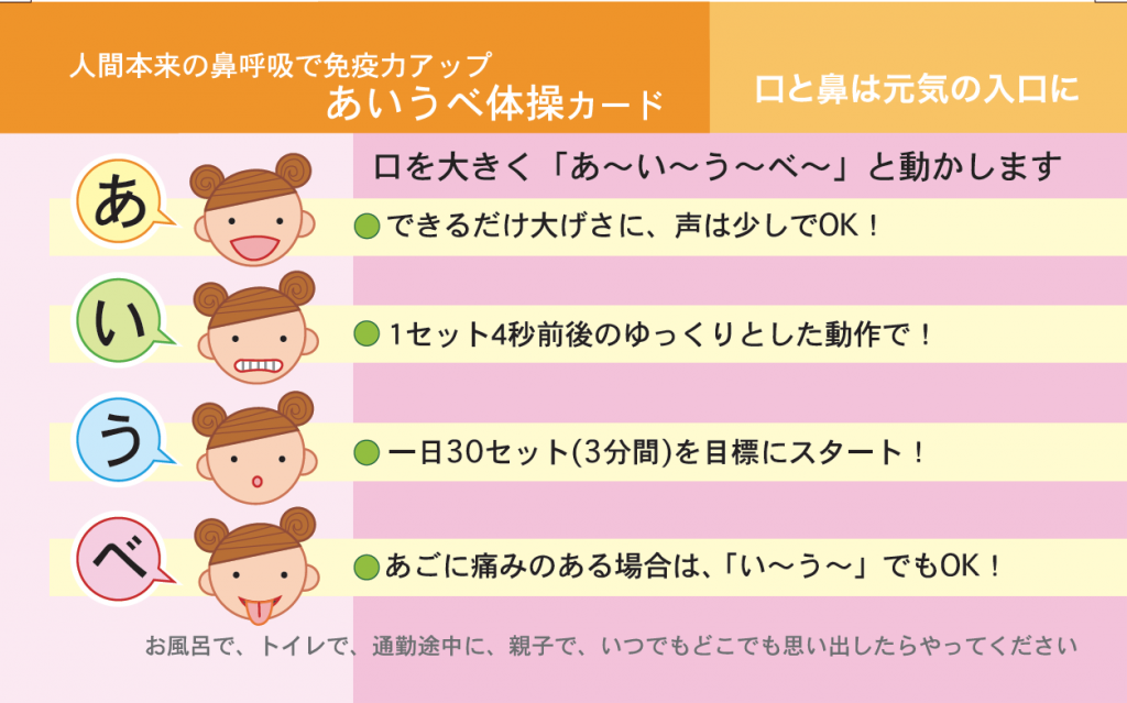あいうべ体操は、「あ~」「い~」「う~」「べ~」と口を動かすだけの簡単な体操です。