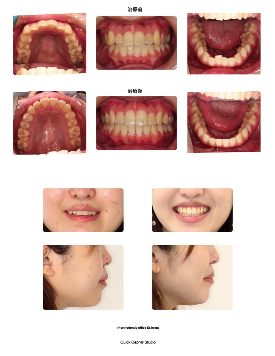 【主な症状】上下顎前歯部叢生(ガタガタ)/上下顎前歯軽度唇側傾斜(上下の前歯が前方にやや傾斜している状態)/口元の軽度前突(口元がやや出ている状態。口唇閉鎖時にやや唇に緊張がある状態)/正中線のズレ