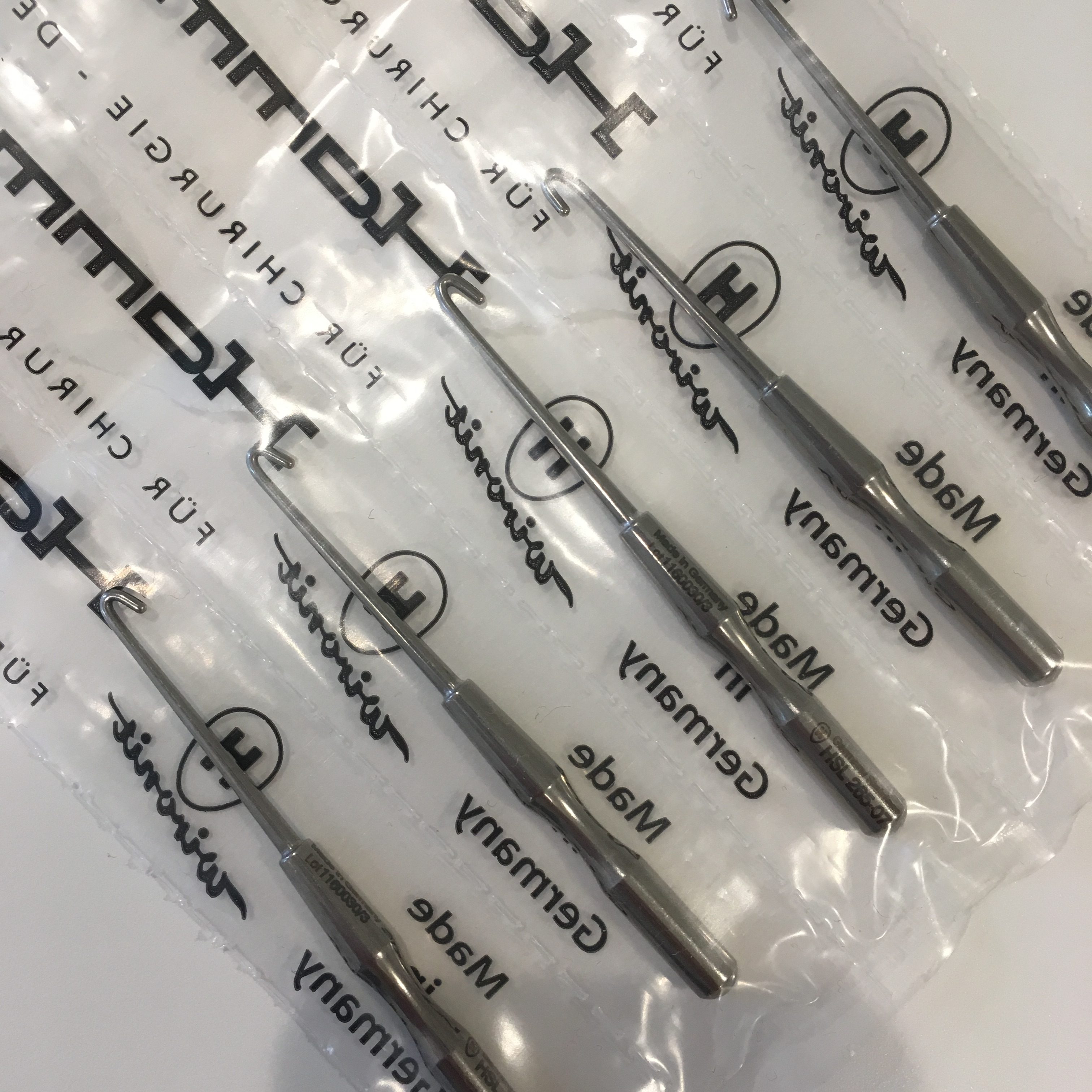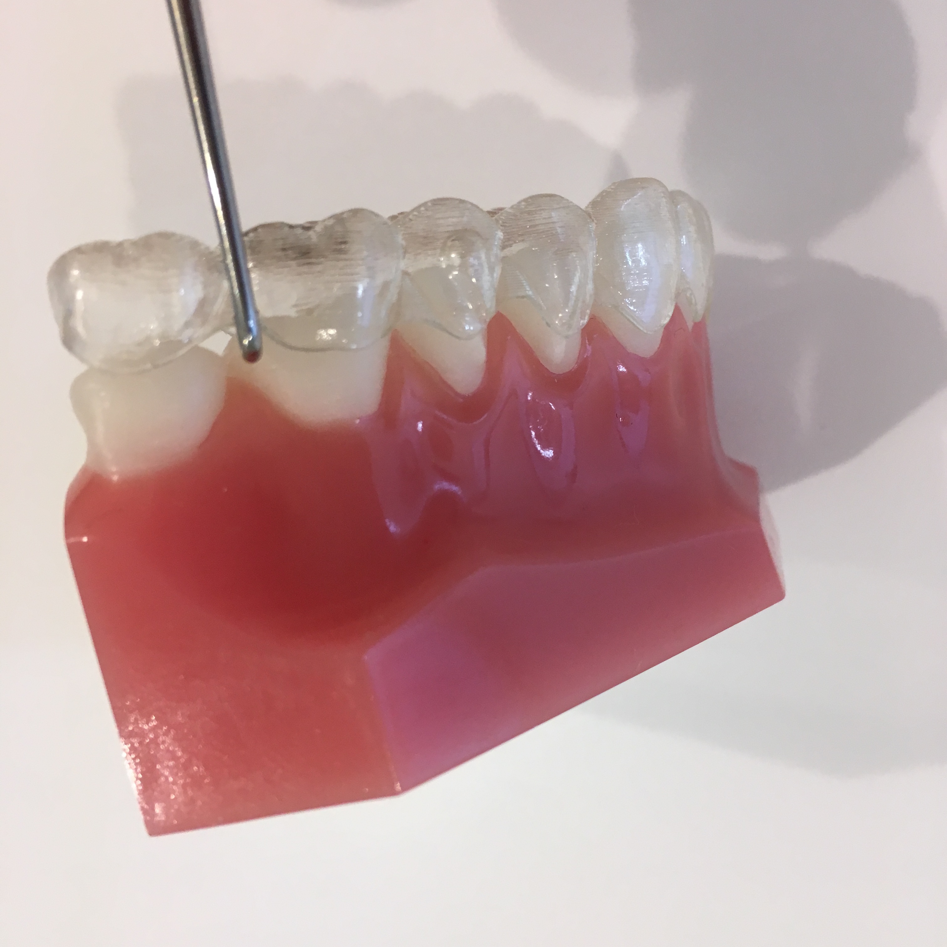 金属製のフックでマウスピース型矯正装置(インビザライン)のアライナー(マウスピース)を取り外しできる器具です。