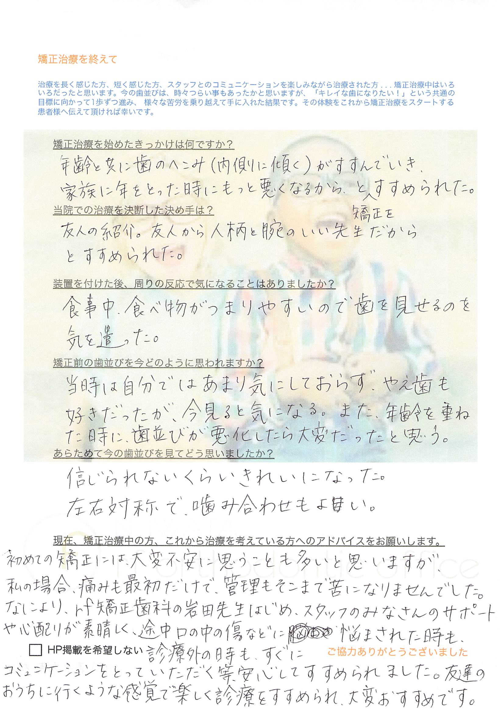 年齢と共に歯のへこみ(内側に傾く)がすすんでいき、家族に年をとった時にもっと悪くなるからと矯正をすすめられた。