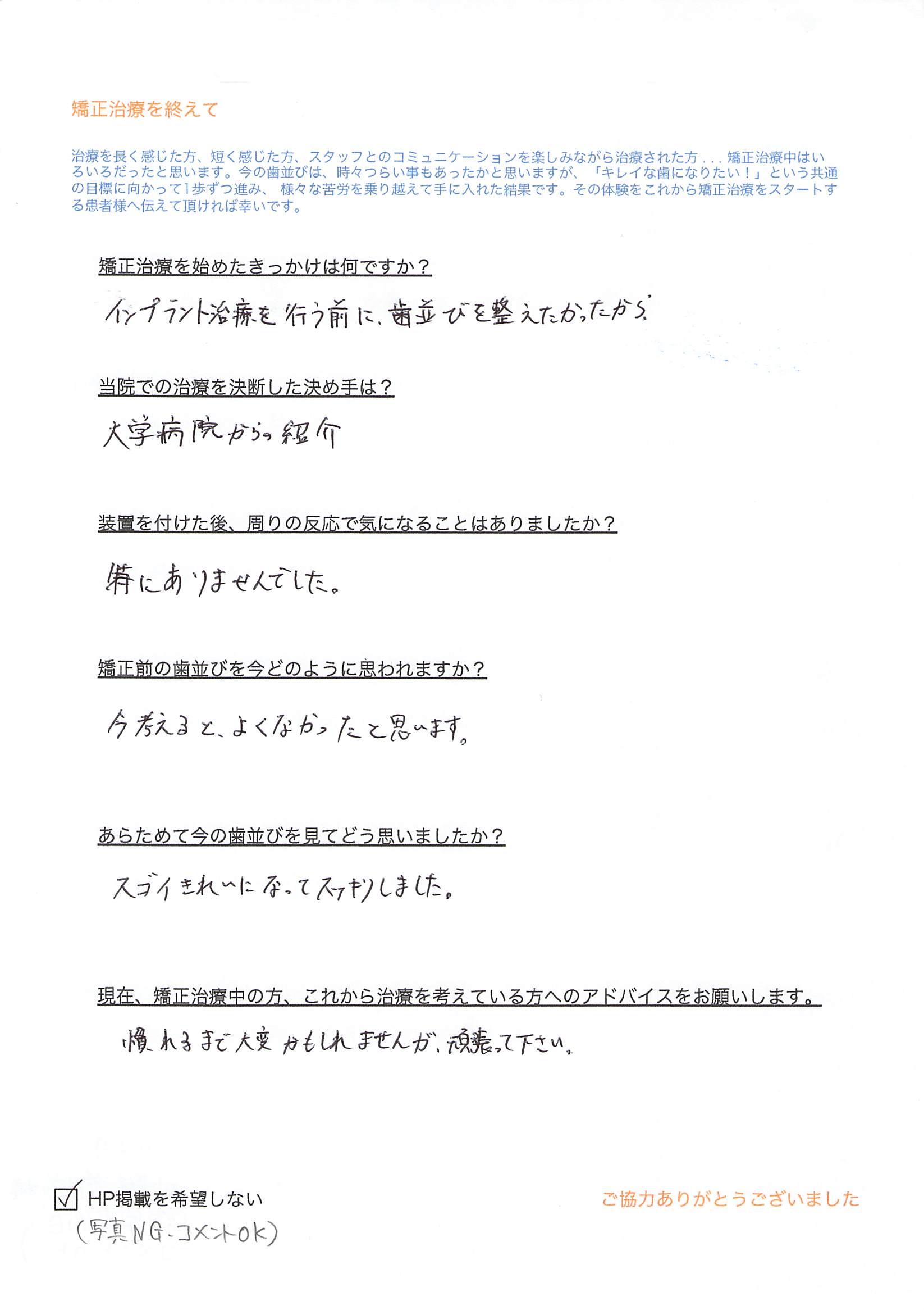 Q)現在、矯正治療中の方、これから治療を考えている方へのアドバイスをお願いします。
