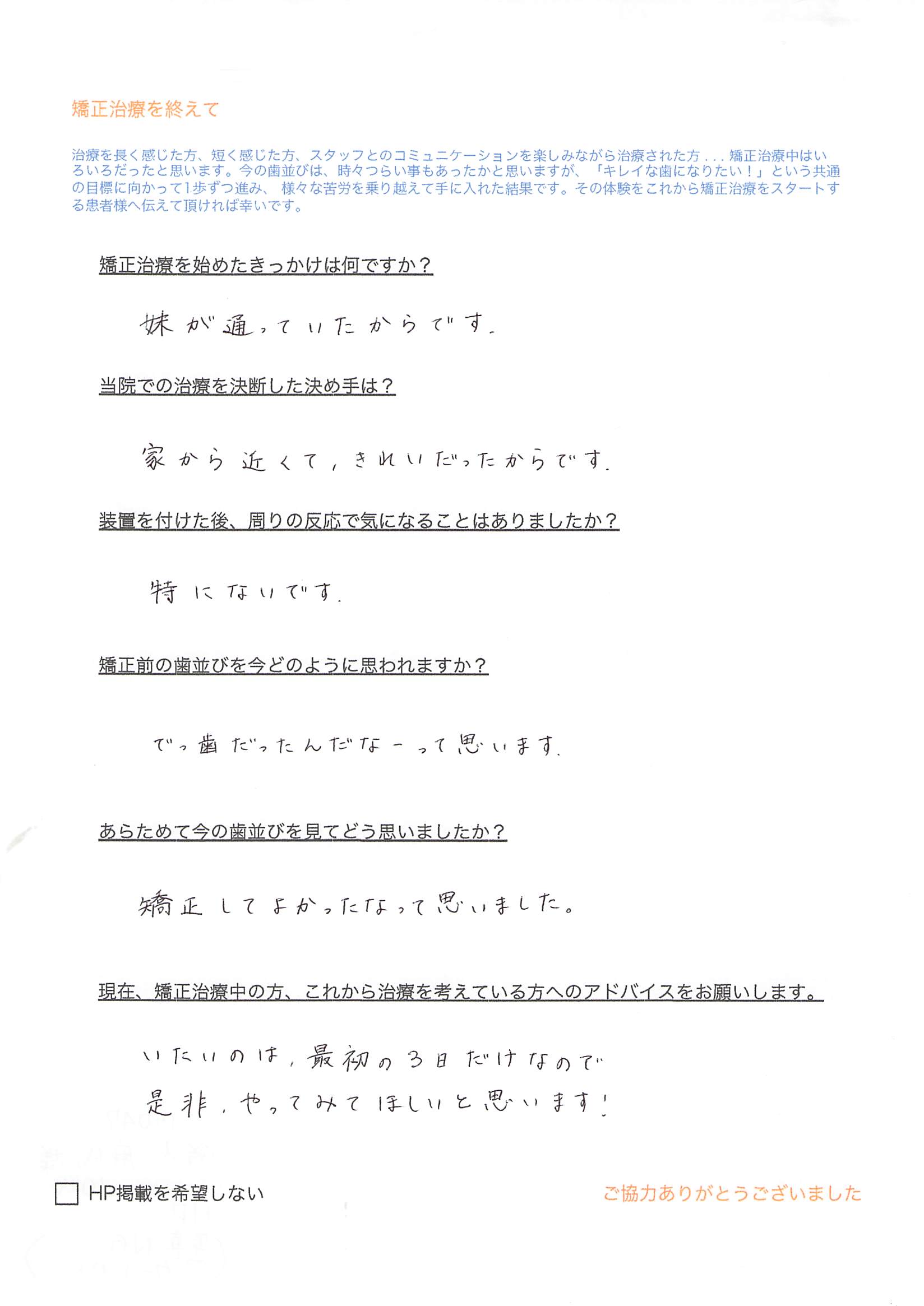 Q)現在、矯正治療中の方、これから治療を考えている方へのアドバイスをお願いします。