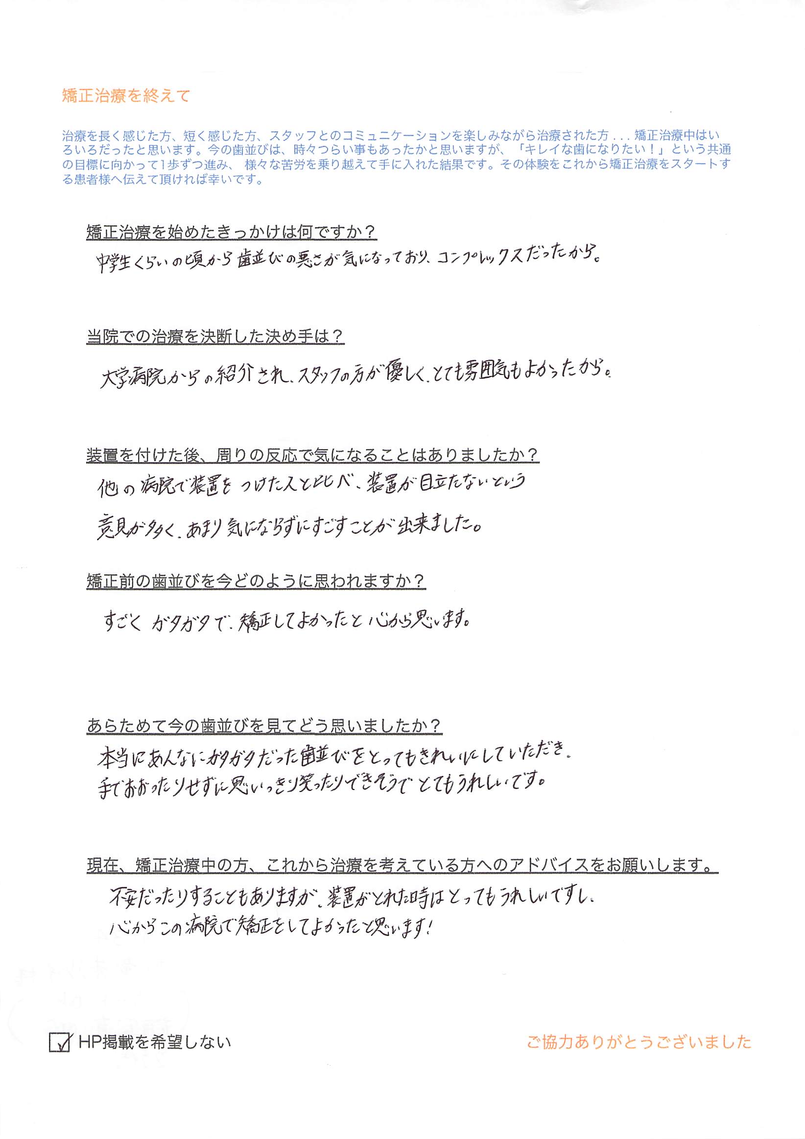 本当にあんなにガタガタだった歯並びをとってもきれいにしていただき、手でおおったりせずに思いっきり笑ったりできそうでとてもうれしいです。