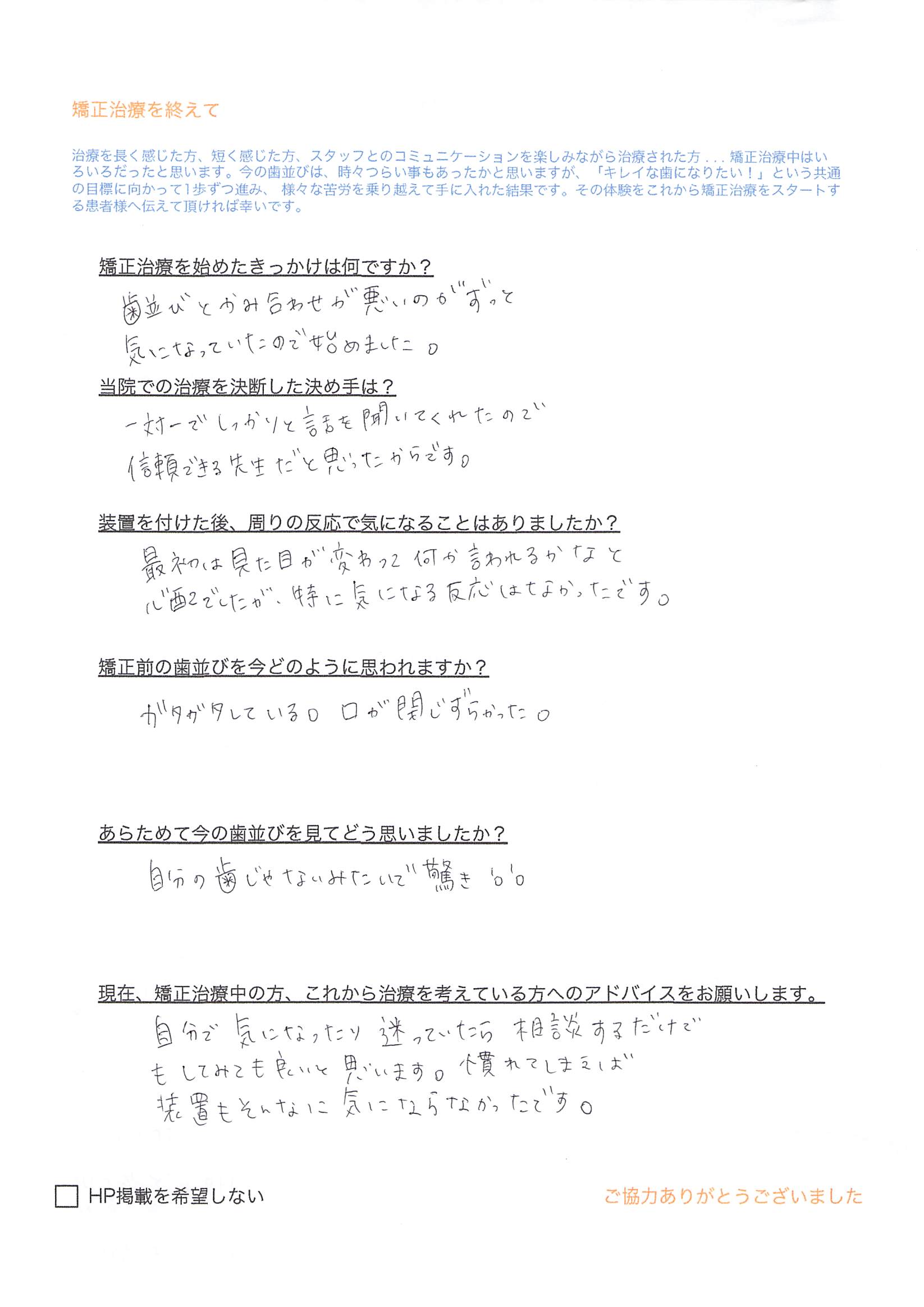 Q)現在、矯正治療中の方、これから治療を考えている方へのアドバイスをお願いします。