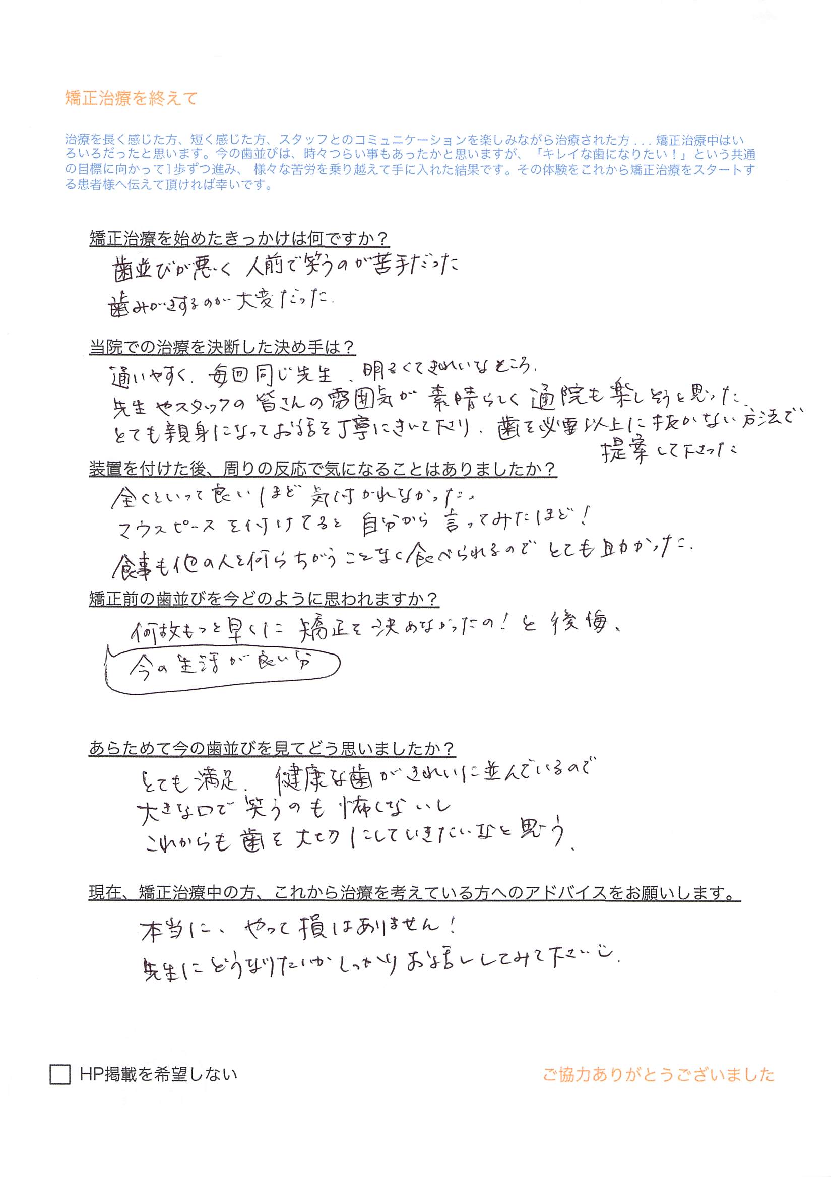 Q)現在、矯正治療中の方、これから治療を考えている方へのアドバイスをお願いします。
