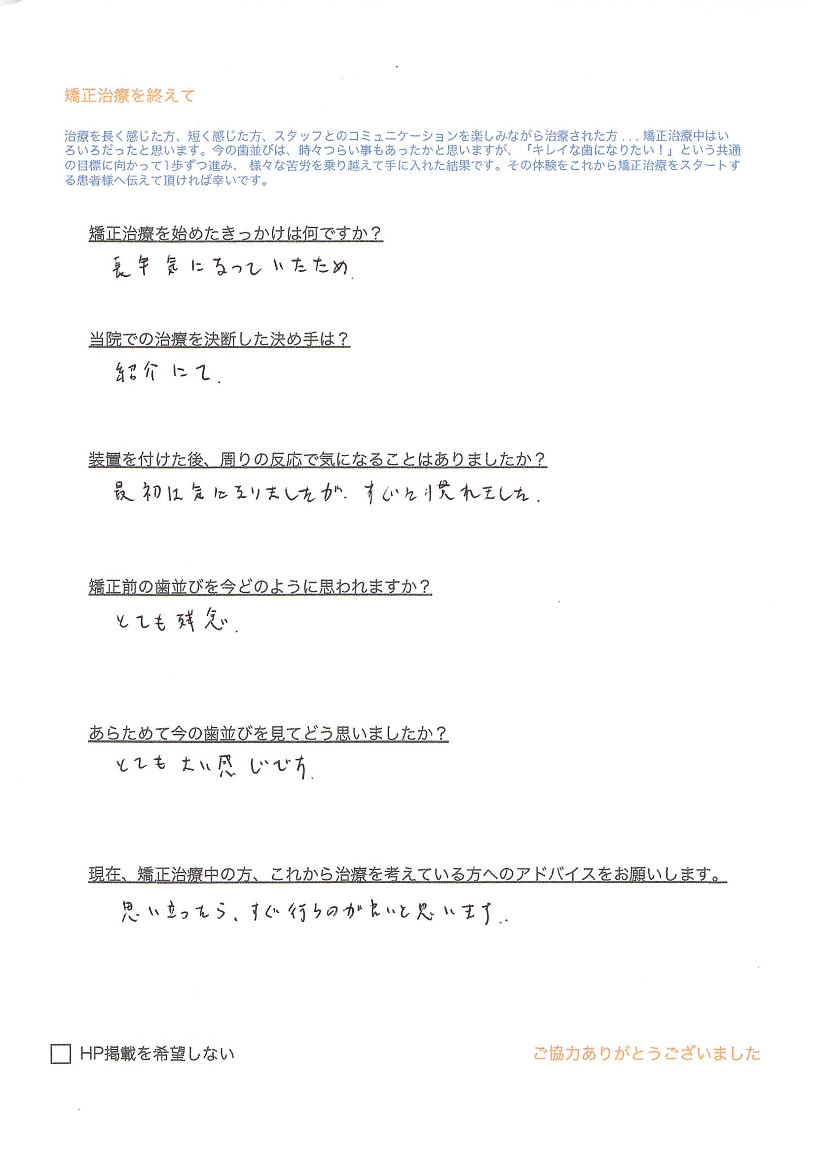 Q)現在、矯正治療中の方、これから治療を考えている方へのアドバイスをお願いします。