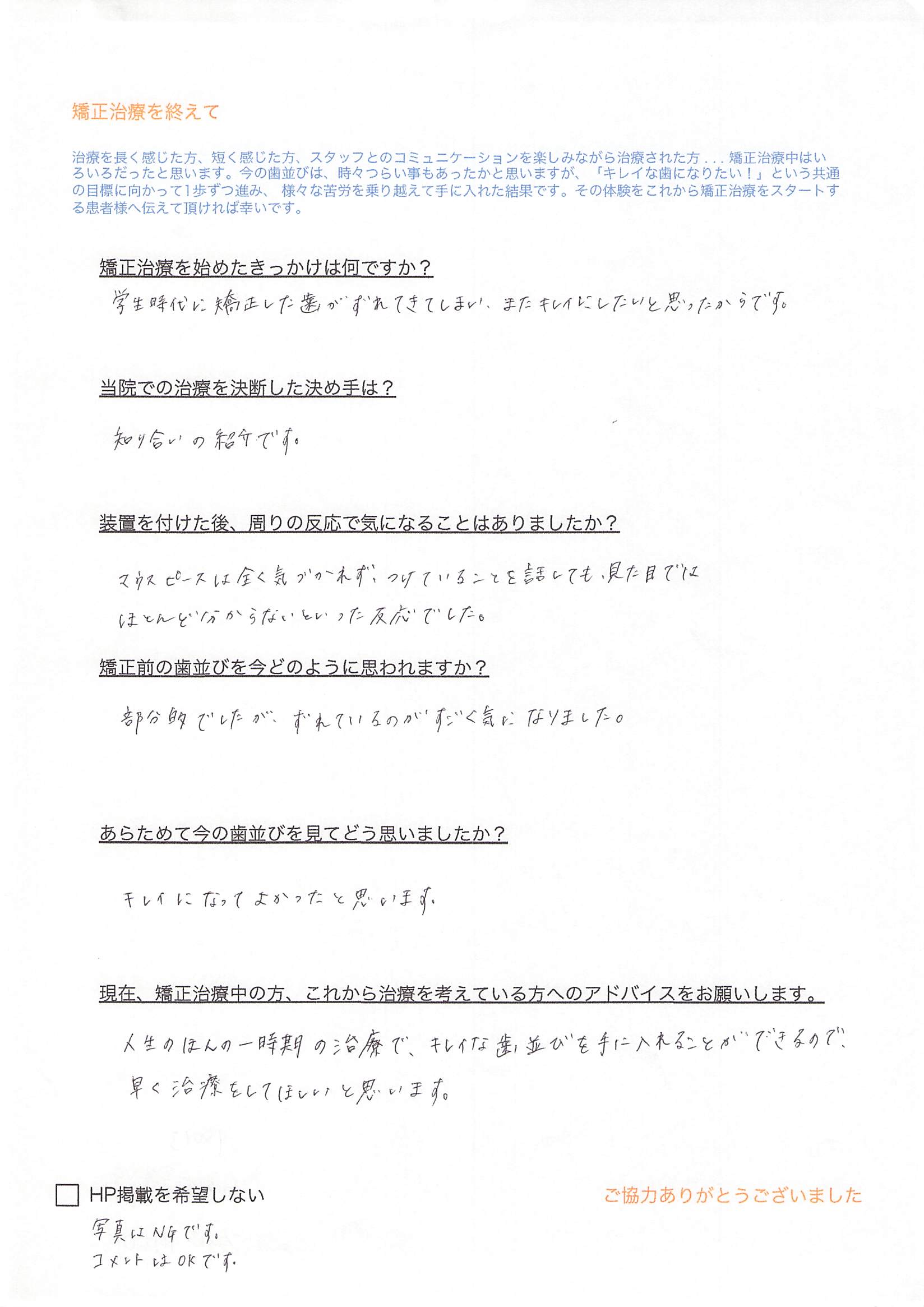人生のほんの一時期の治療で、キレイな歯並びを手に入れることができるので早く治療をしてほしいと思います。