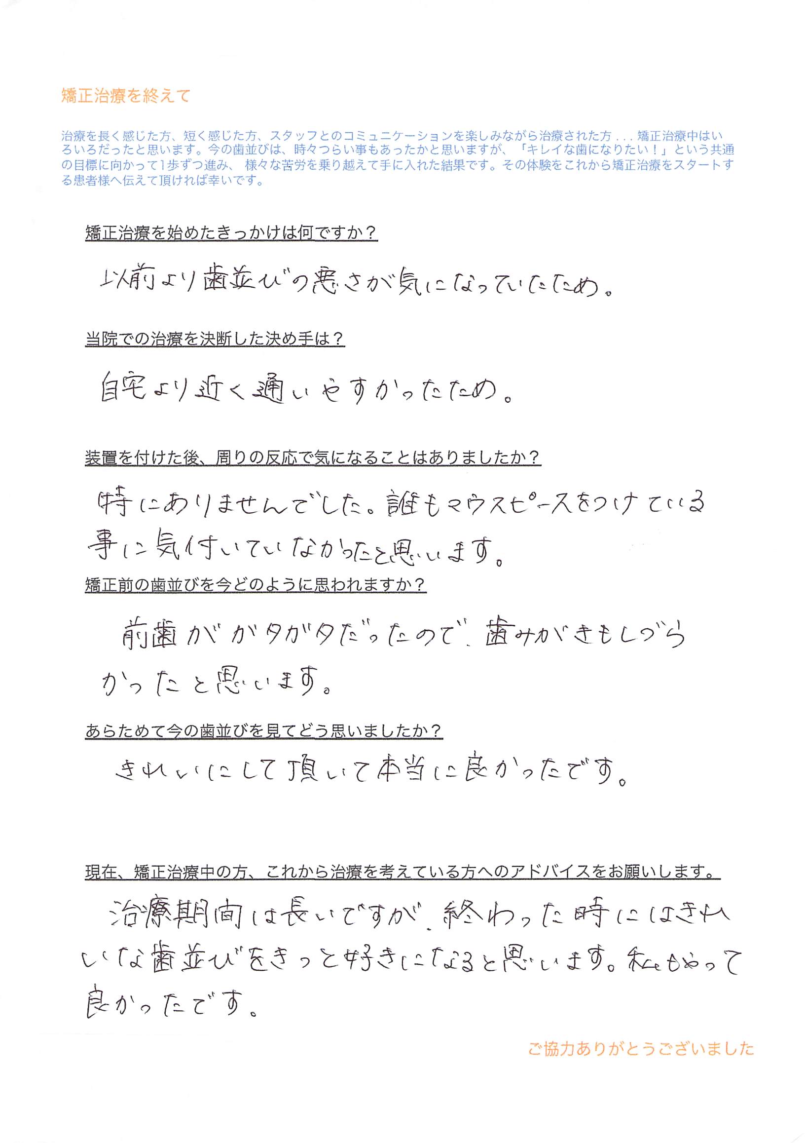 Q)現在、矯正治療中の方、これから治療を考えている方へのアドバイスをお願いします。