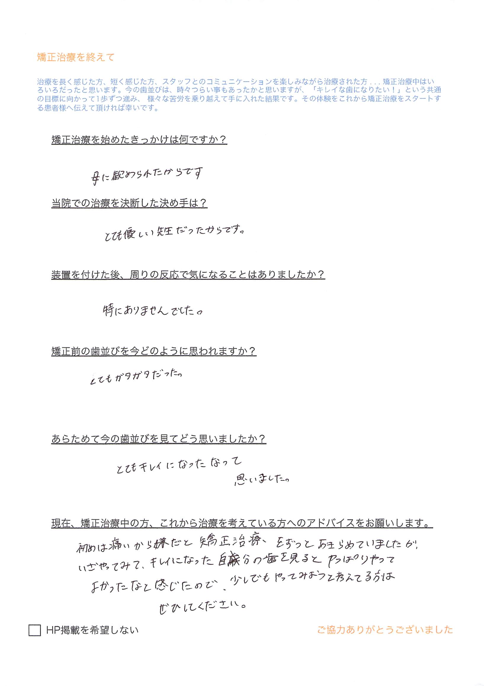 初めは痛いから嫌だと矯正治療をずっとあきらめていましたが、いざやってみて、キレイになった自分の歯を見るとやっぱりやってよかったなと感じたので、少しでもやってみようと考えてる方はぜひしてください。