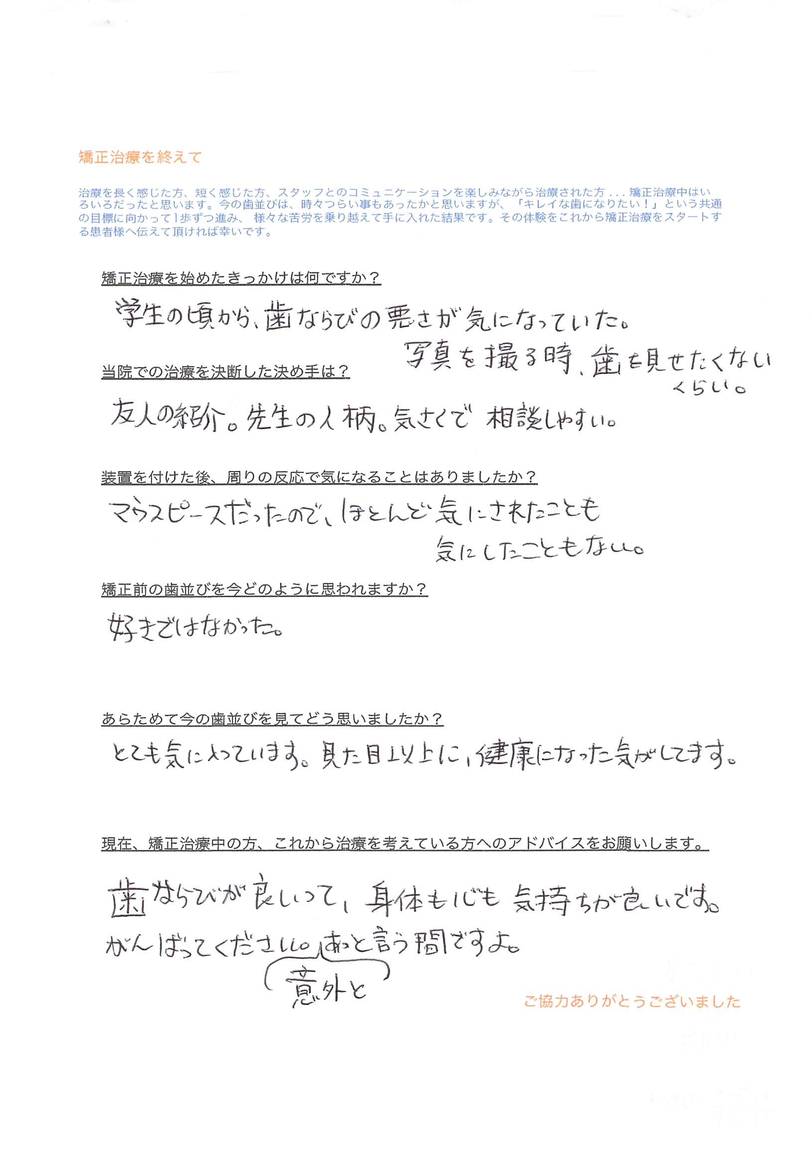 Q)現在、矯正治療中の方、これから治療を考えている方へのアドバイスをお願いします。