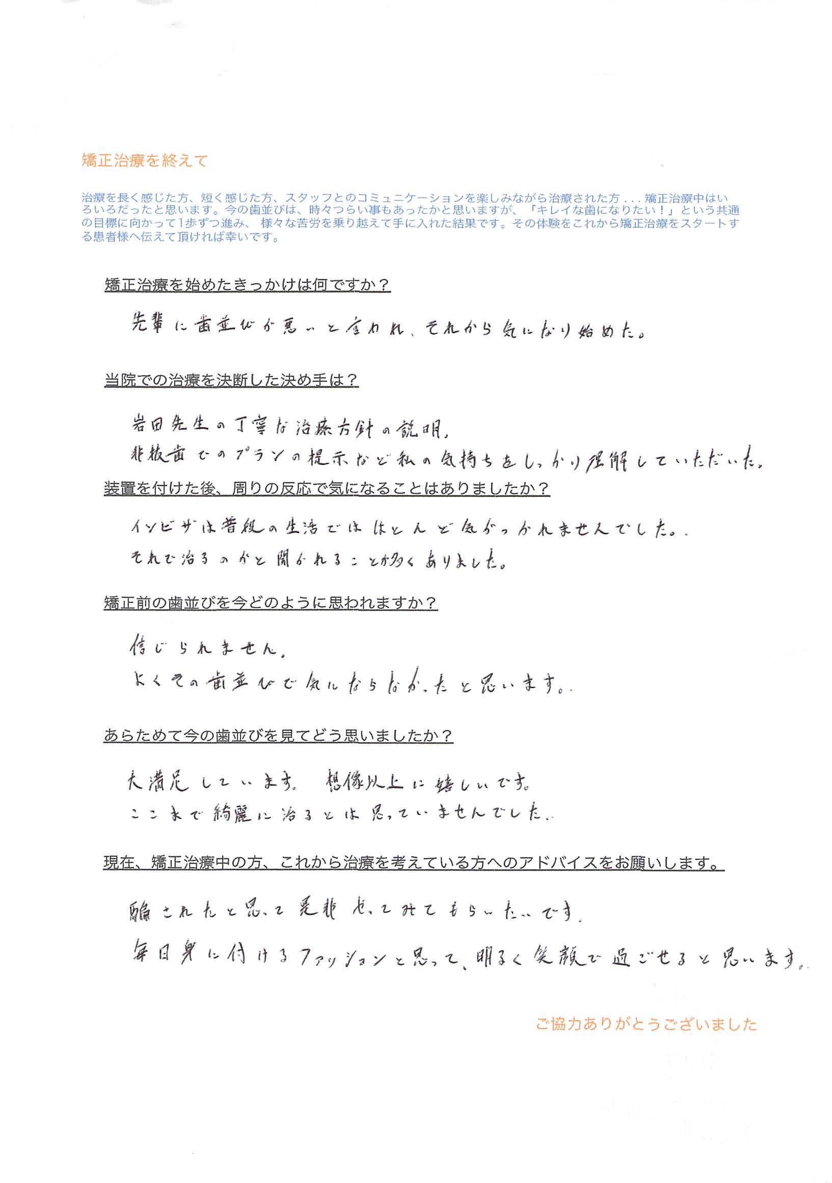 Q)現在、矯正治療中の方、これから治療を考えている方へのアドバイスをお願いします。